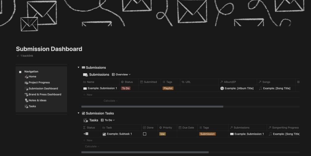 - Submission Tracker (to track submissions and pitches to Playlists, Blogs, etc.)
